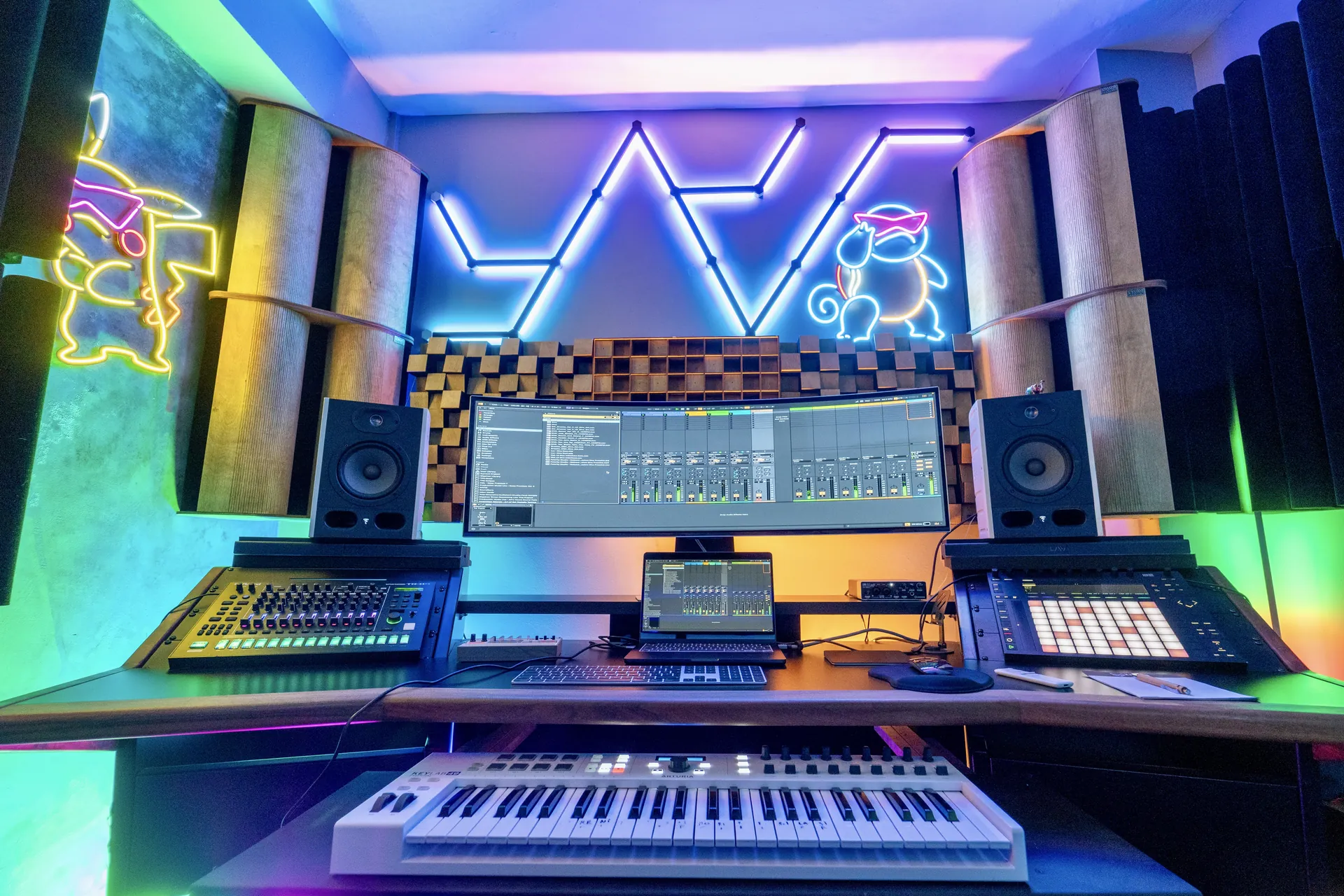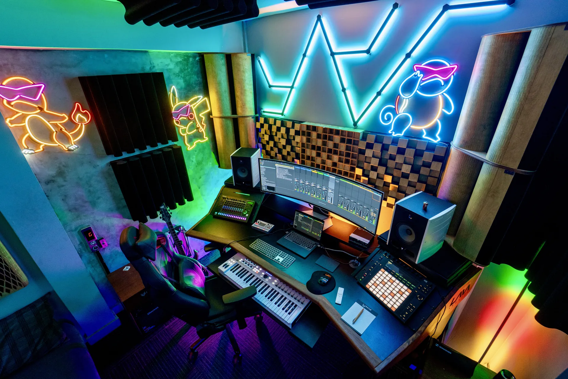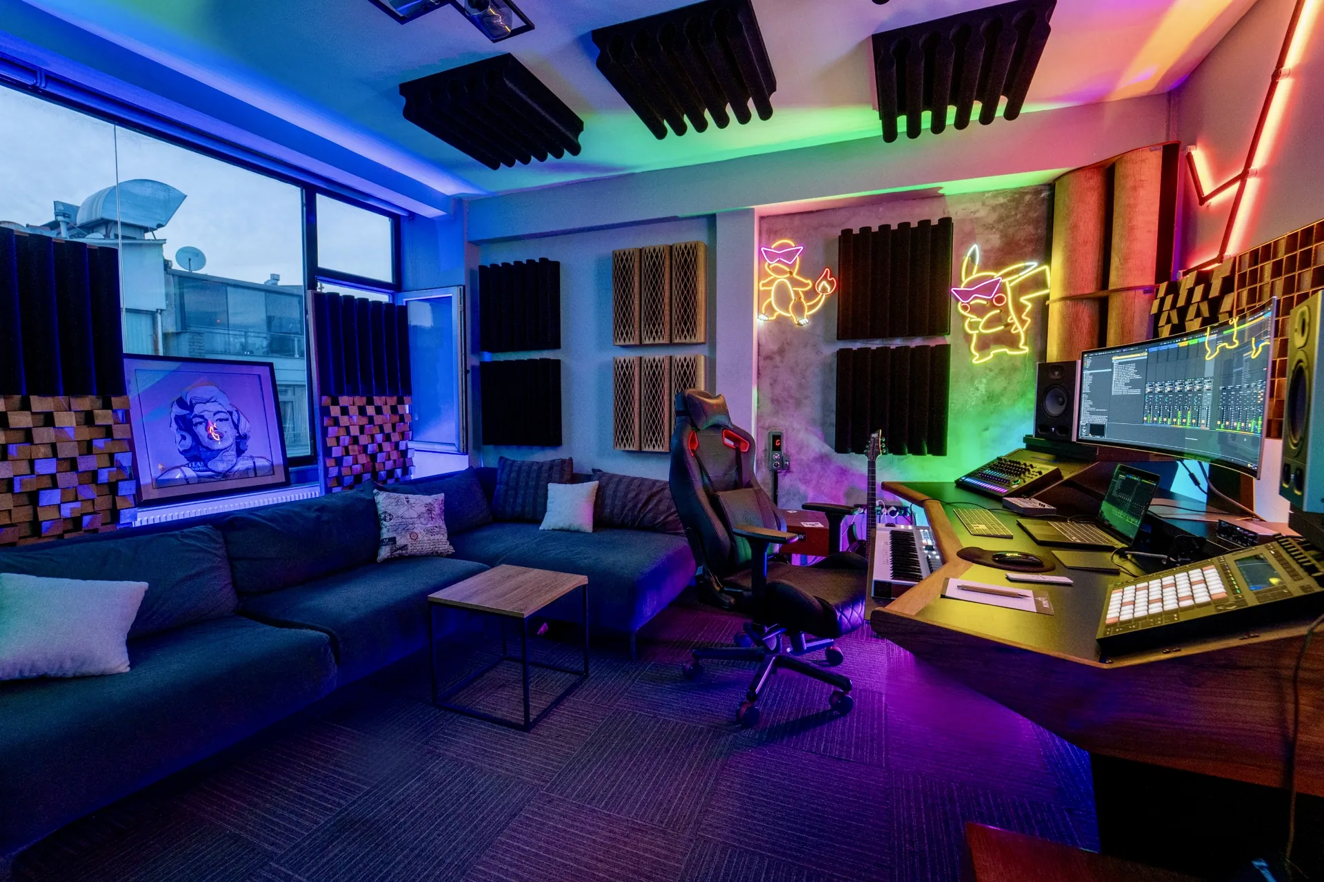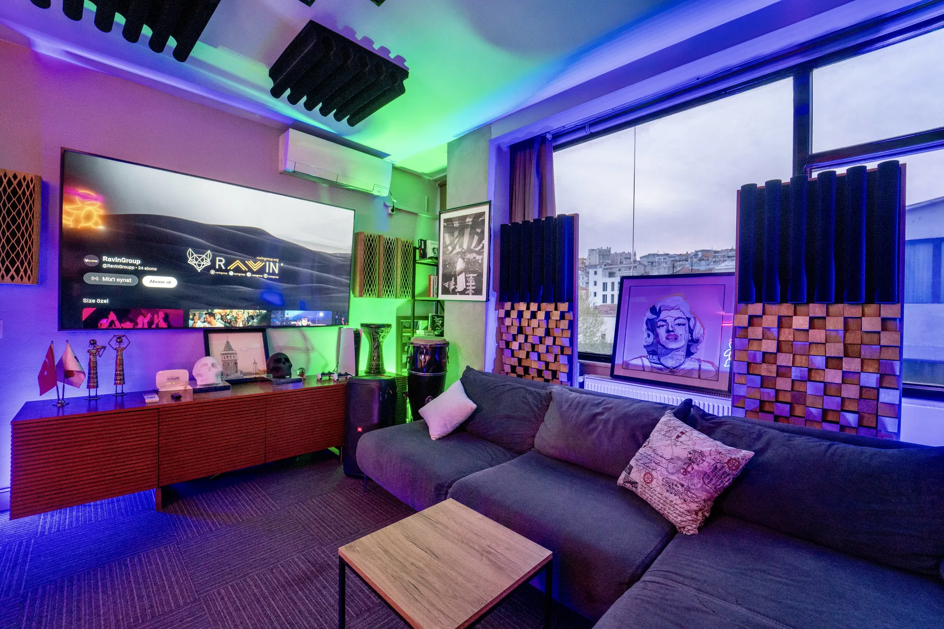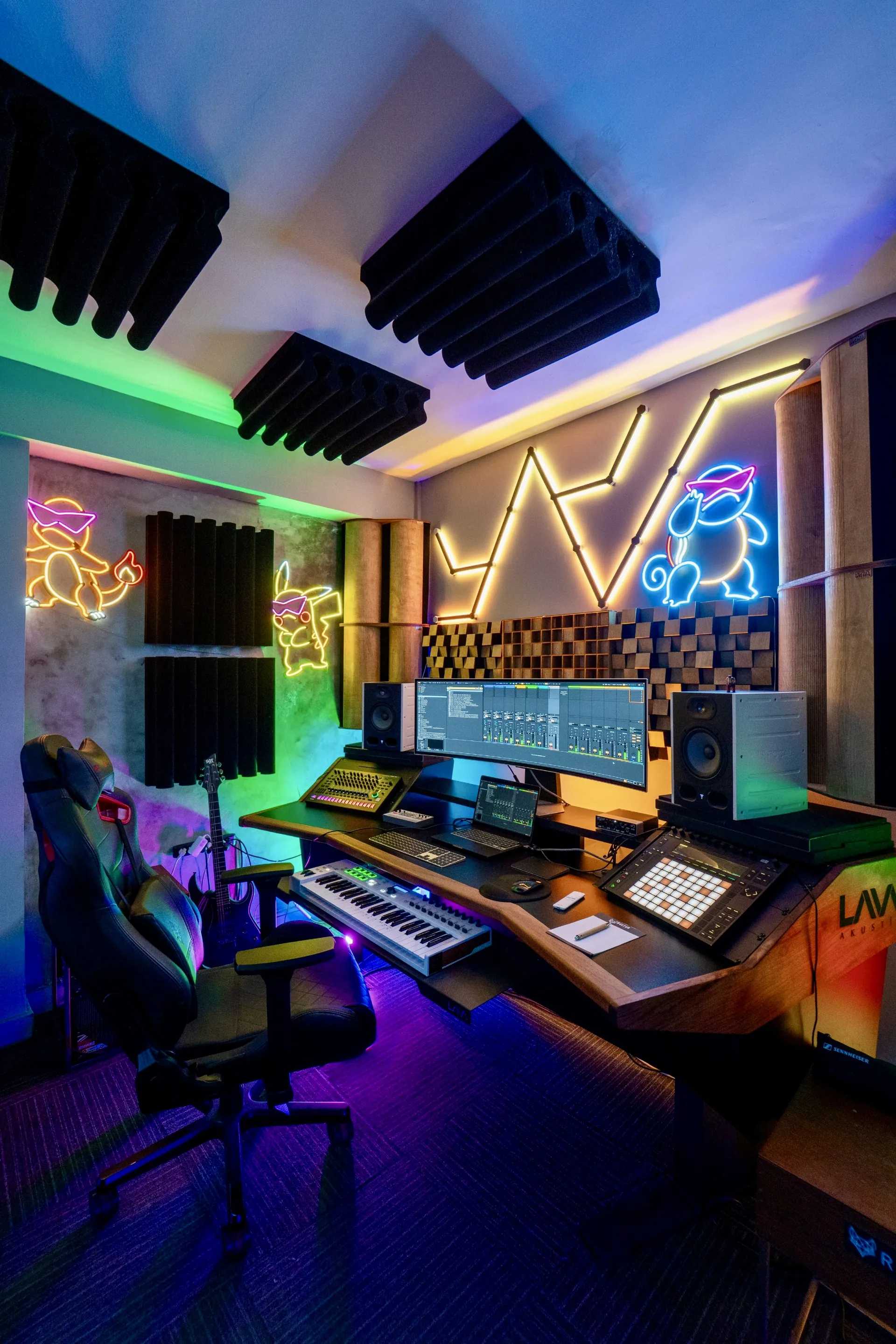 Prodüksiyon odamız, Türkiye'nin en kaliteli akustik panel ve stüdyo mobilyası üreticisi Lava Akustik tarafından, Ravin Akademi için özel olarak tasarlandı.